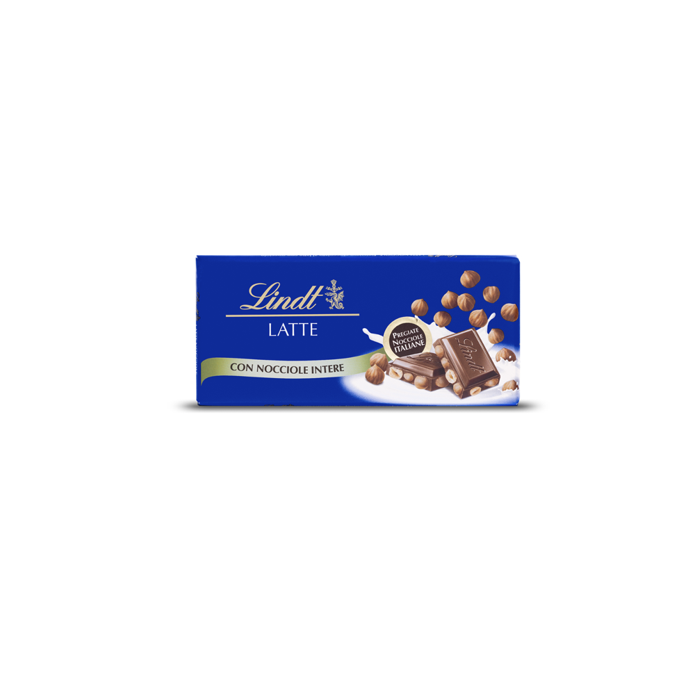Cremosa tavoletta Lindt. Delizioso cioccolato al Latte avvolge le nocciole piemontesi IGP.